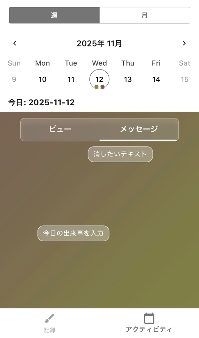 日の気分に近い色を選択するだけで記録が成立し、必要に応じて短いメモを追加できる構成とした。また、過去の記録をカレンダー形式で振り返る機能を備え、感情の変化を視覚的に把握できるよう設計した。